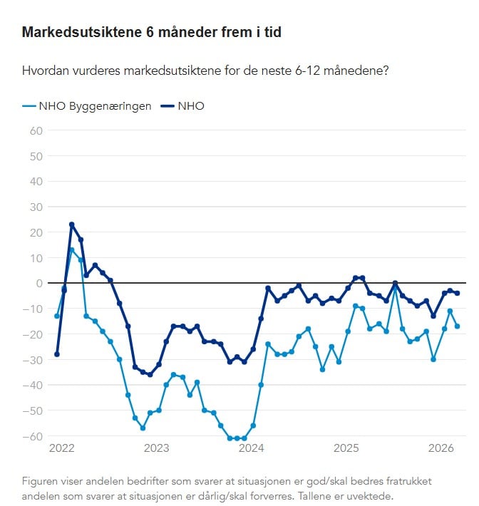 Blant bedriftene i byggenæringen var det 30 prosent som forventet en forverring, mens 13 prosent venter bedring. Dette er et fall fra februar da 28 prosent ventet nedgang mens 17 prosent ventet bedring i markedsutsiktene